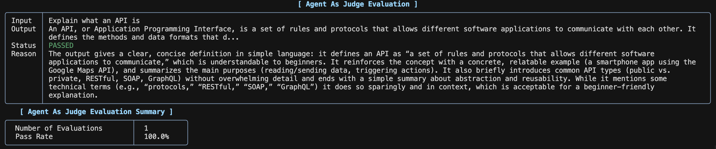 In this example, theAgentAsJudgeEval will evaluate the output of the Agent with their input, providing a score of the Agent’s response according to the custom criteria provided.